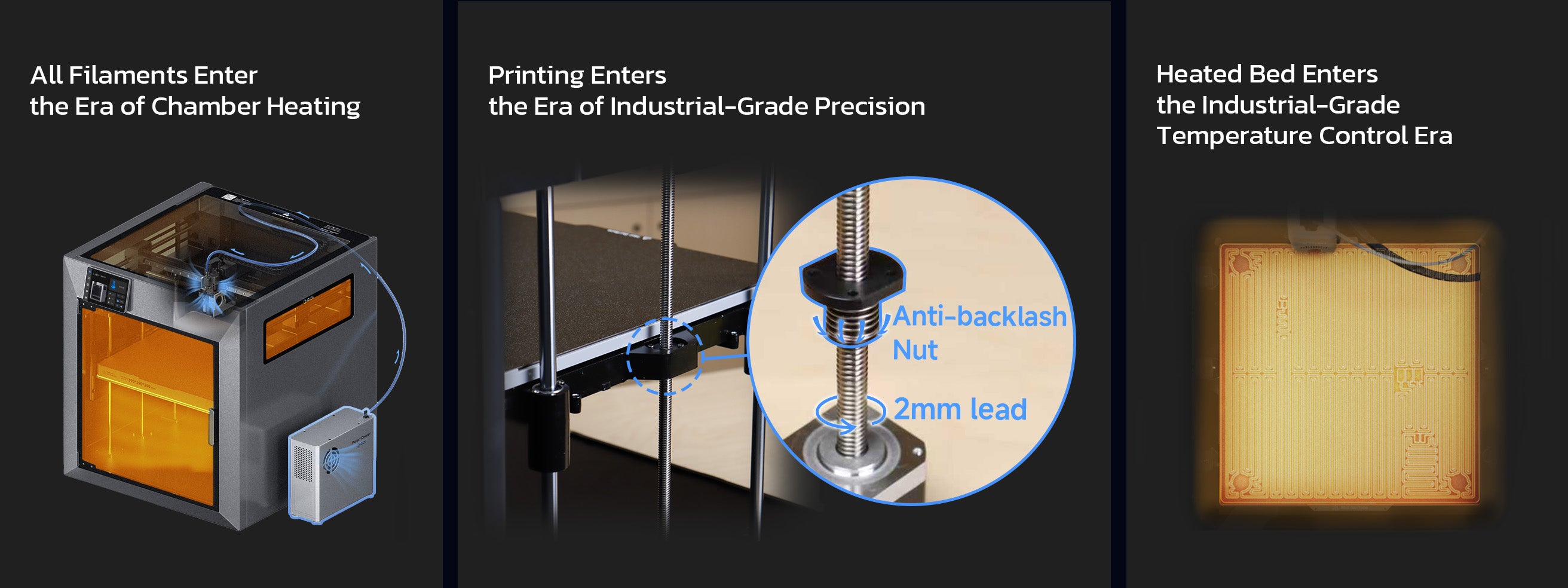 - Professional Thermal Control: The actively heated chamber up to 65°C ensures perfect prints with difficult materials such as ABS, ASA and Nylon, eliminating the risk of warping.