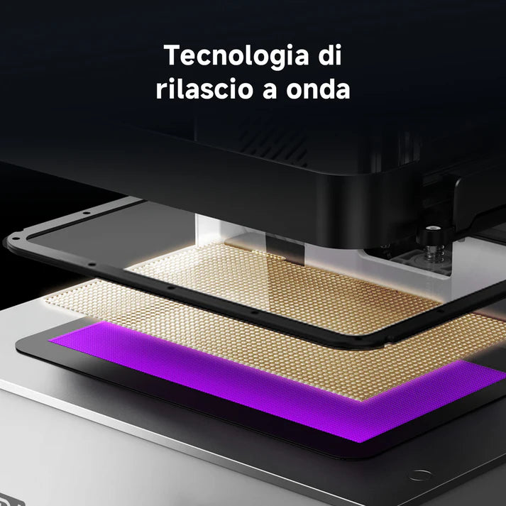 Wave Release Technology — Stacchi più delicati, stampe più riuscite Il film NFEP proprietario riduce la forza di distacco degli strati fino al 60% rispetto al tradizionale FEP. Meno stress sul modello, meno rumore, meno fallimenti su stampe complesse con supporti sottili o geometrie aggettanti.