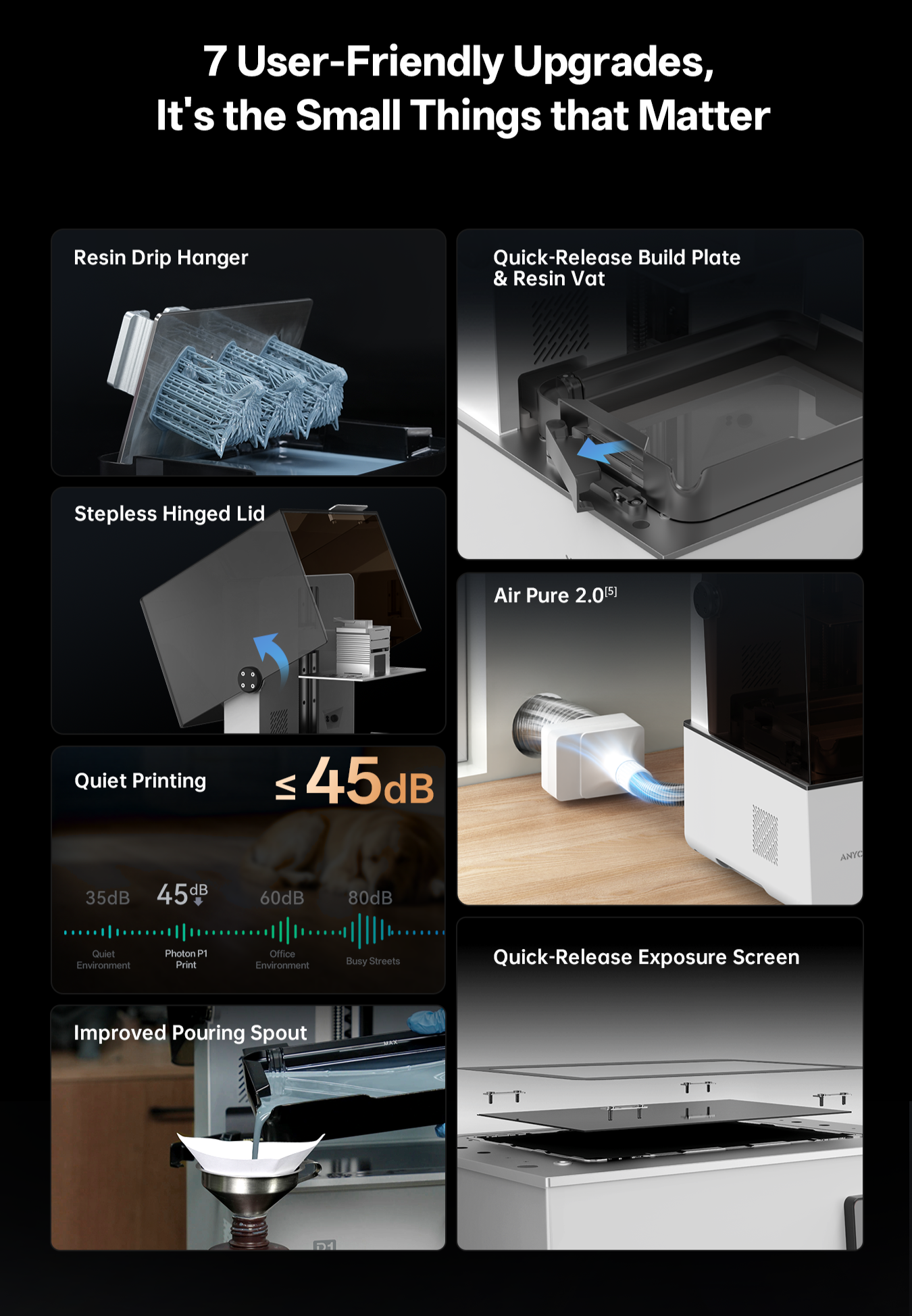 Silenziosa come un ufficio ≤ 45 dB durante tutta la stampa. La Photon P1 può lavorare accanto a te senza disturbare.
