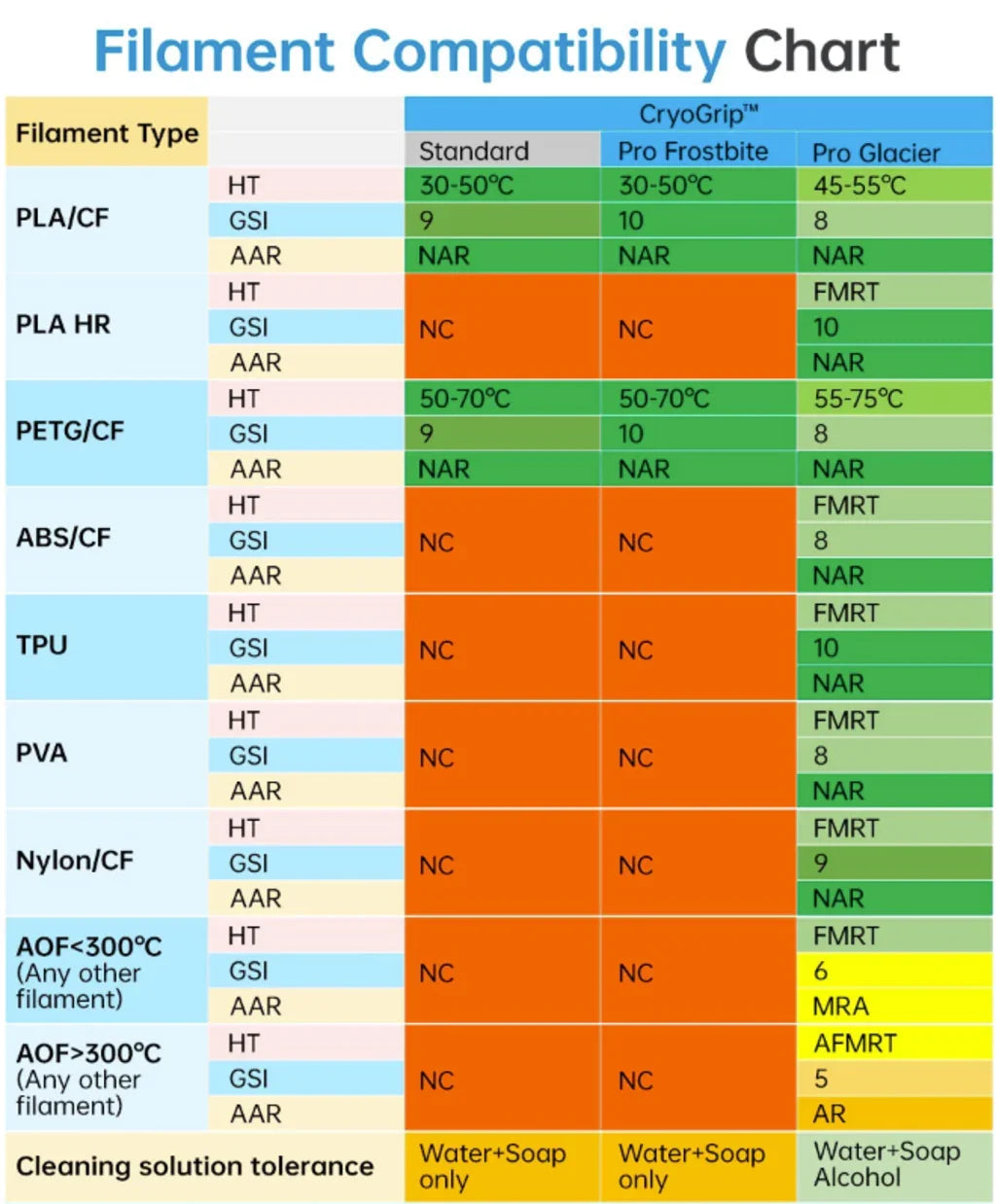 CryoGrip Pro Glacier è una piastra di stampa resistente e ad alte prestazioni, progettata per garantire un'adesione ottimale e una facile rimozione del modello. È compatibile con una varietà di filamenti, dal PLA e PETG ai materiali ingegneristici come il PA. Grazie alla superficie resistente al calore, riduce al minimo le deformazioni e garantisce una stampa affidabile senza richiedere temperature elevate del letto di stampa.