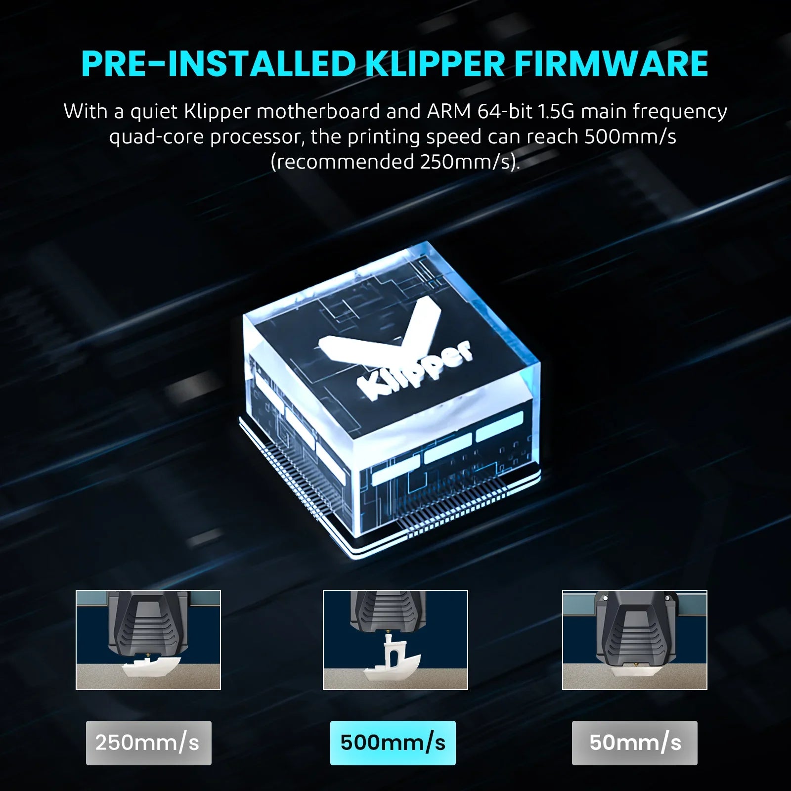 Neptune 4 è dotata del firmware Klipper preinstallato, abbinato a un processore quad-core ARM a 64 bit da 1,5 GHz per un'elaborazione dei comandi più rapida. Questo permette alla stampante di raggiungere velocità fino a 500 mm/s, rendendola una delle più veloci della sua categoria. Inoltre, la ROM da 8 GB offre un'ampia capacità di archiviazione per un rapido accesso ai dati, migliorando l'efficienza di stampa complessiva. Funzionalità avanzate come l'input shaping riducono le vibrazioni meccaniche, eliminando artefatti comuni come aneismi, ghosting o increspature, mentre la funzione di avanzamento della pressione garantisce un flusso di materiale costante per stampe più fluide.