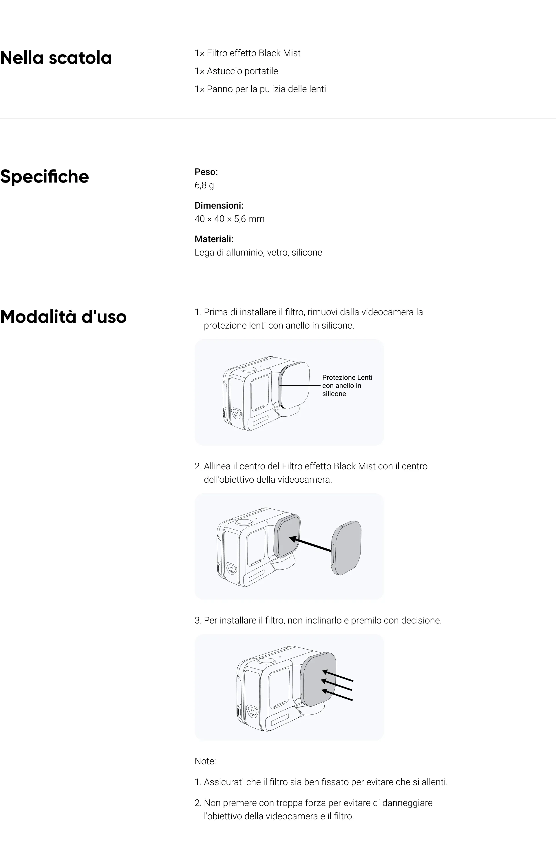 Assicurati che il filtro e l'obiettivo della videocamera siano entrambi puliti e asciutti. Se è necessario pulirli, utilizza il panno apposito. Installa il filtro in un ambiente pulito e asciutto, poiché eventuali corpi estranei sull'obiettivo della videocamera o sulla superficie del filtro potrebbero influire sul risultato finale.