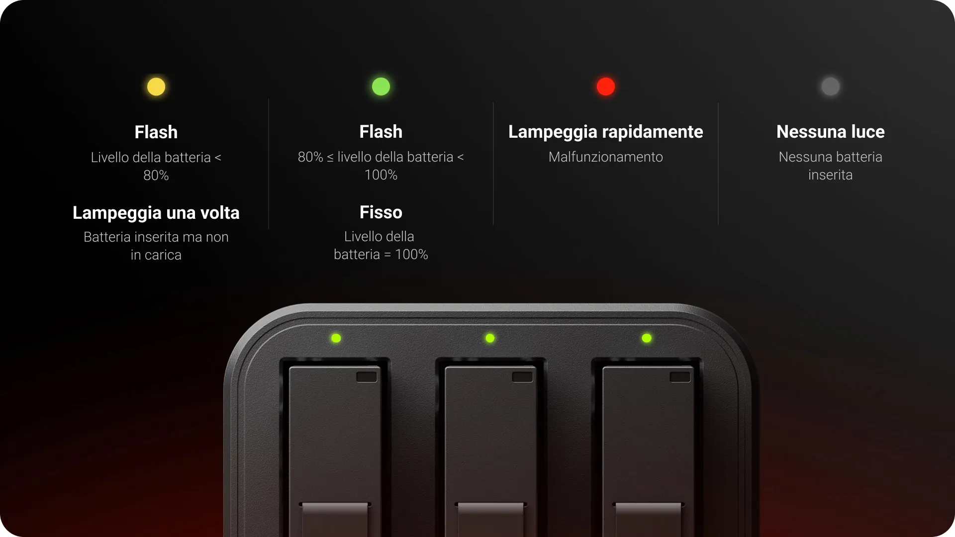 Carica al 100% fino a tre batterie in simultanea e in sicurezza. Ogni slot si ricarica in modo indipendente, così non dovrai preoccuparti di un eventuale sovraccarico.