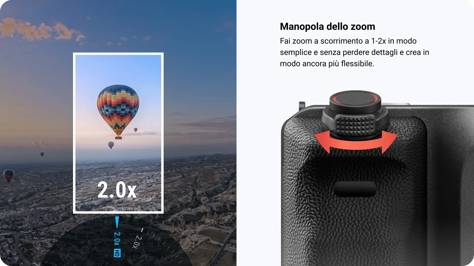 Trasforma la tua action cam in una compatta e controlla zoom senza perdita di qualità, controllo dell'esposizione, cambio modalità e altre funzioni direttamente dall'impugnatura.