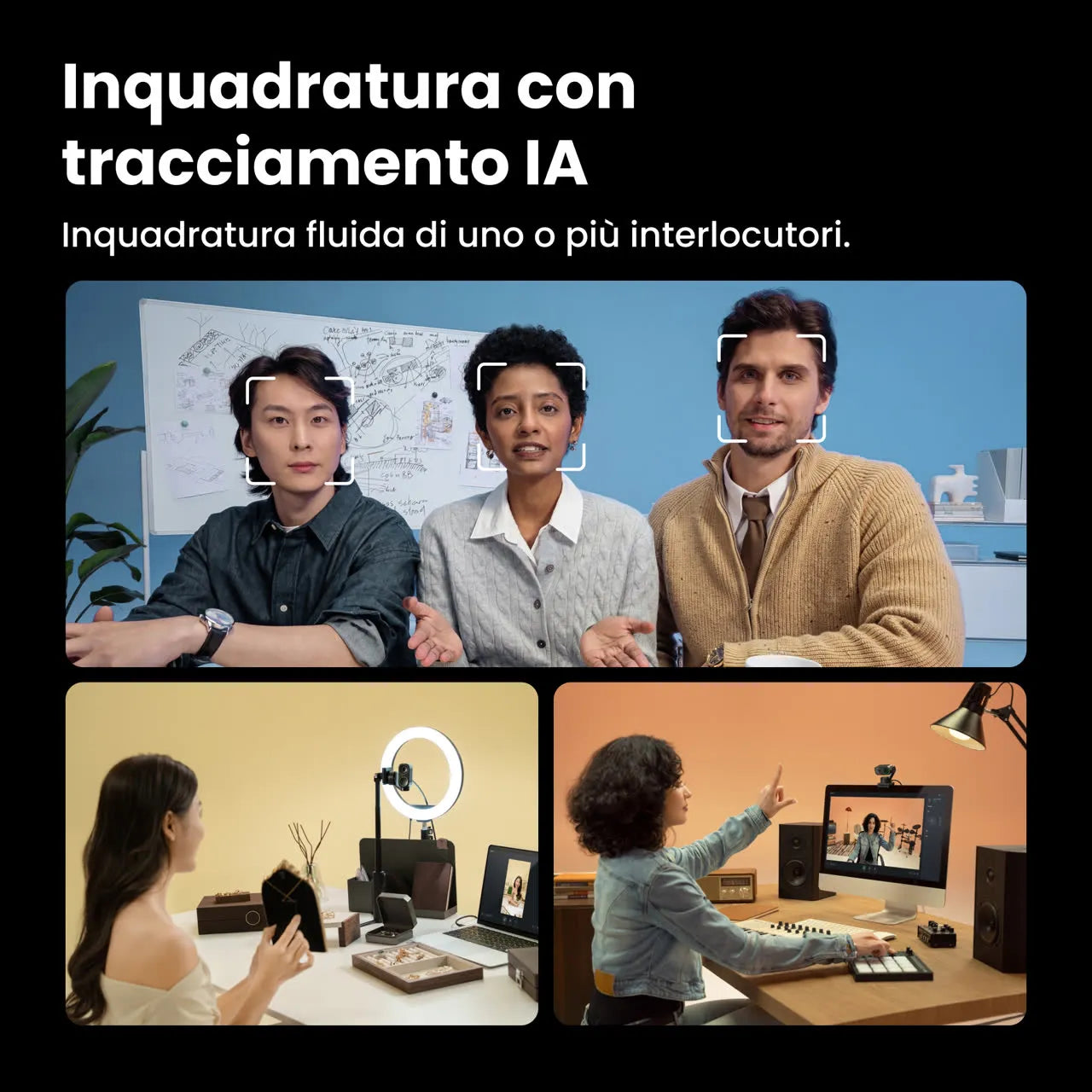 Il tracciamento AI di nuova generazione mantiene il soggetto sempre perfettamente inquadrato con movimenti fluidi e naturali. Le modalità Whiteboard e DeskView ampliano la versatilità anche in ambito didattico o dimostrativo, mentre le gesture avanzate permettono di controllare zoom e inquadratura con semplici movimenti della mano.