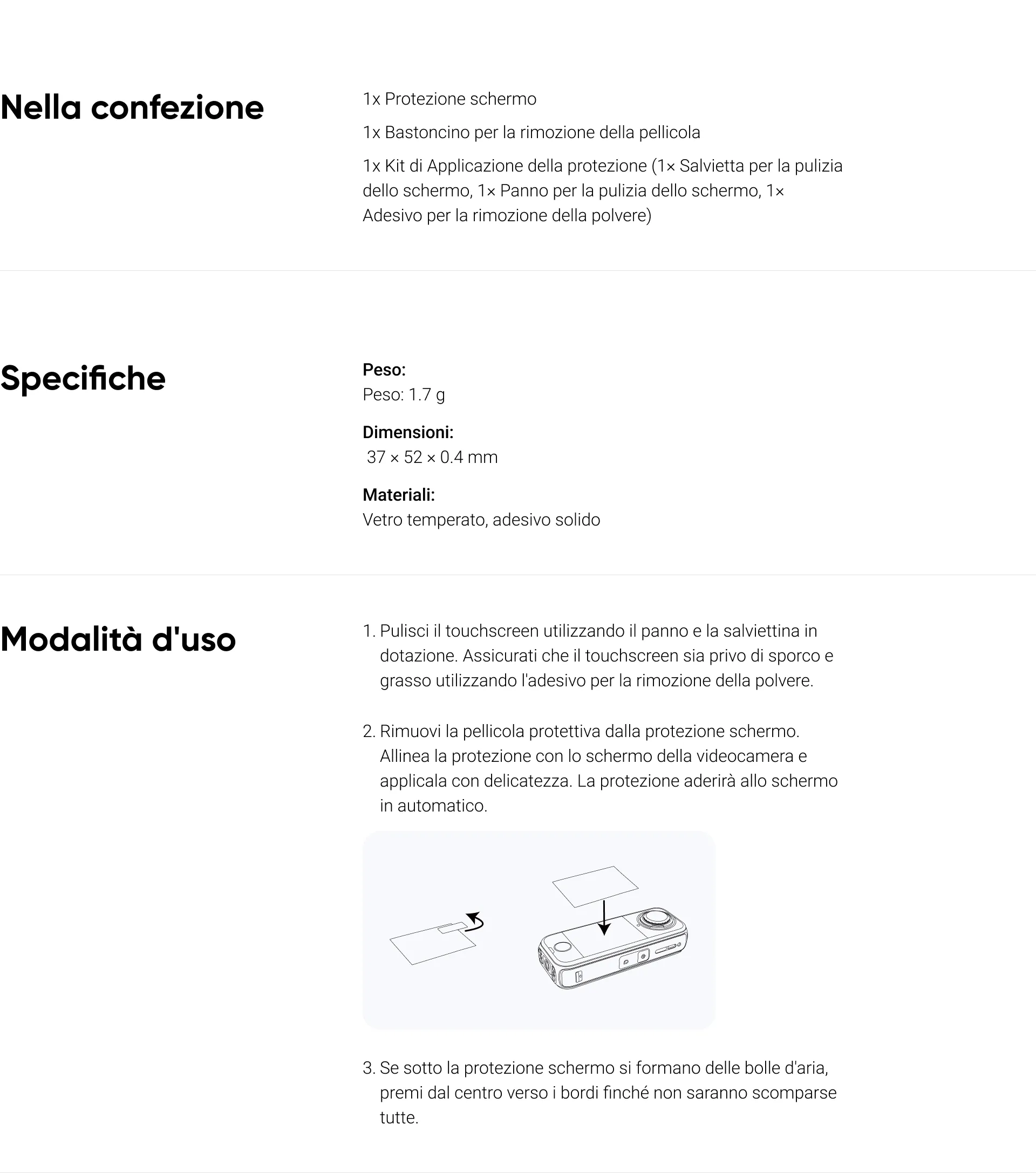 2. Non riutilizzare più di una volta la stessa protezione schermo, in quanto la presenza di polvere o sporco potrebbe causare la formazione di bolle d'aria e ridurre l'adesività.