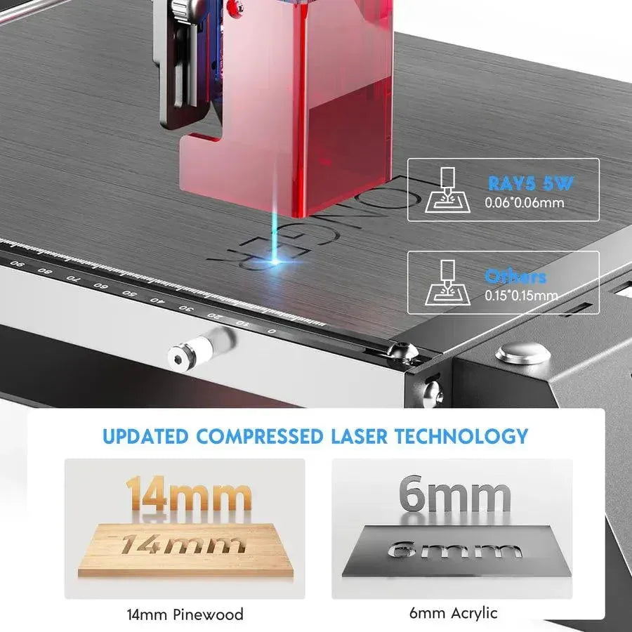 L'incisore laser Ray5 5W ha una potenza di uscita di 5,5 W e adotta l'ultima tecnologia laser compressa FAC, la dimensione del punto laser è 0,08*0,08 mm, il che rende l'incisione o il taglio più forti e precisi. La velocità di incisione può raggiungere fino a 10000 mm/min.