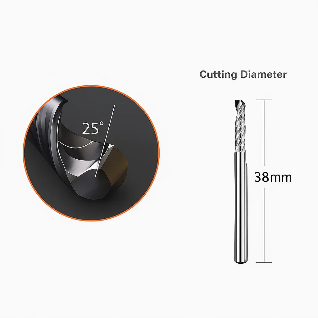La Makera Punta a spirale 'O' a un tagliente per metallo - Codolo da 1/8" è un utensile in carburo solido progettato per lavorazioni di precisione su metalli non ferrosi, legno, plastica e materiali compositi. Grazie all'angolo di elica di 25°, garantisce un'evacuazione superiore dei trucioli, riducendo la ri-taglio dei materiali e assicurando una finitura pulita e precisa. Adatta per taglio di contorni, pulizia facciale, fresatura di tasche e foratura su lastre e blocchi.