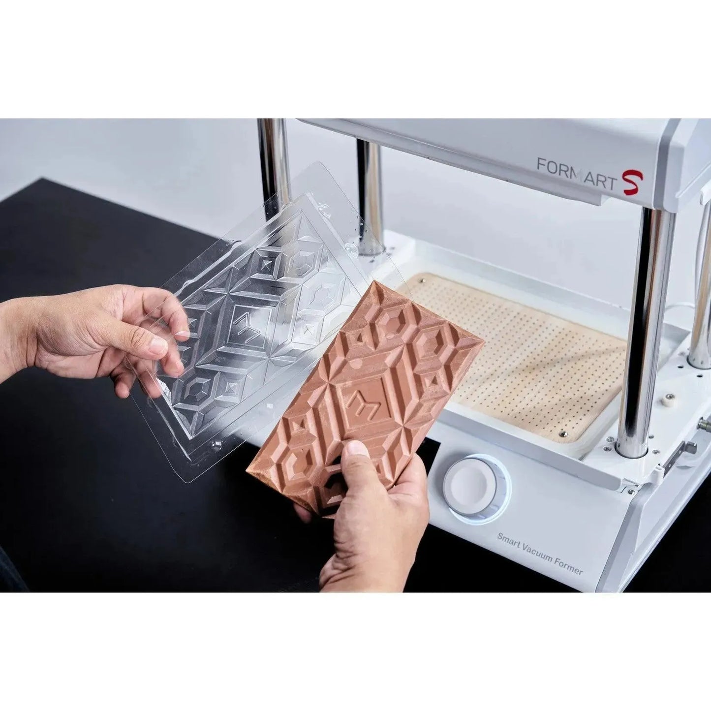 Il PET (polietilene tereftalato) è stato realizzato con l'80% di bottiglie in PET riciclato, ha un'elevata trasparenza e resistenza agli urti, particolarmente adatto per stampi per cioccolato o altre applicazioni che richiedono elevata trasparenza ed elevata resistenza agli urti.