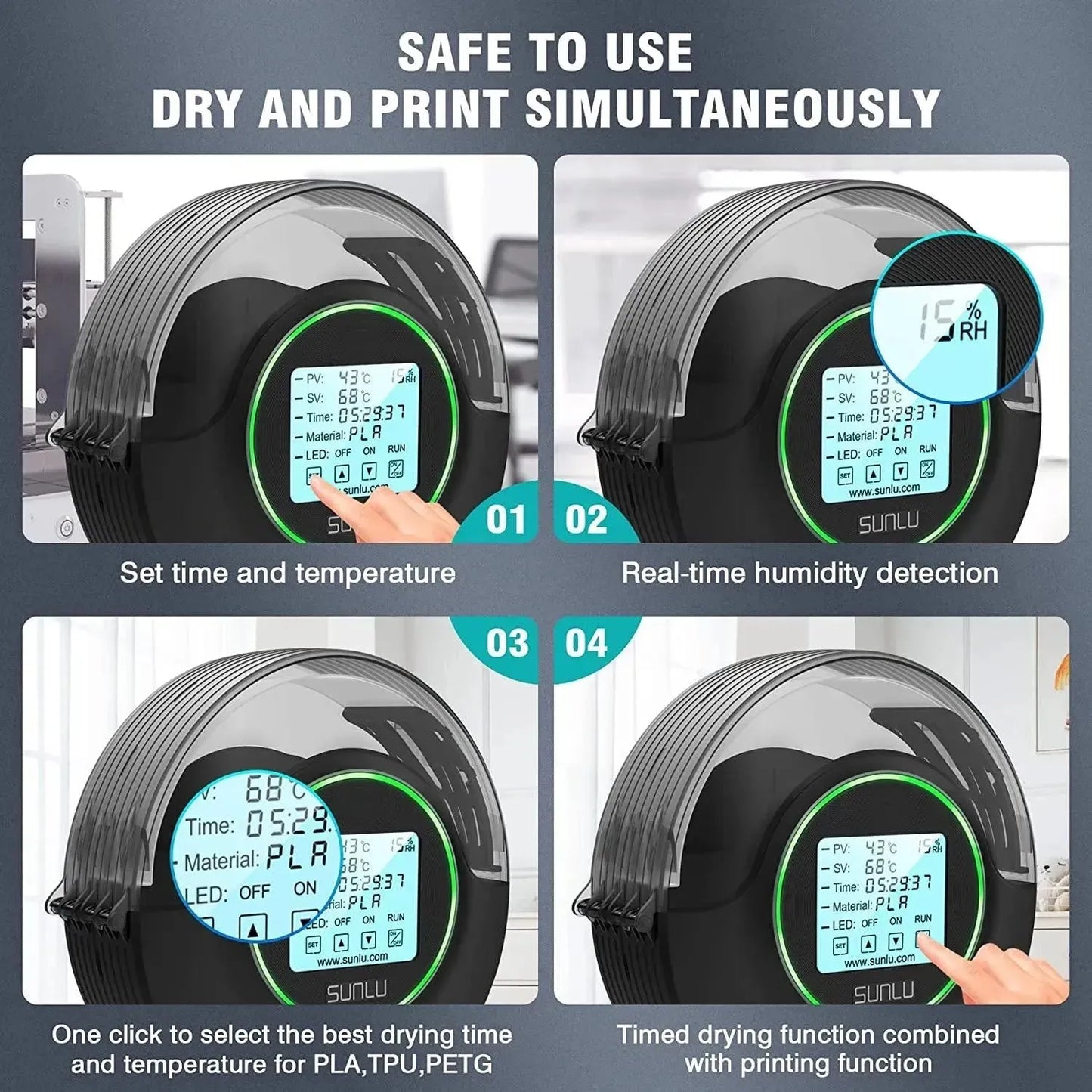 Migliora la stampa con filamento essiccato SUNLU S2. Il Filament Dry Box rimuoverà l'umidità in eccesso del filamento di stampa 3D, aiutandoti a evitare problemi comuni come intasamento, scarsa adesione e migrazione dello strato causati dall'umidità del filamento.