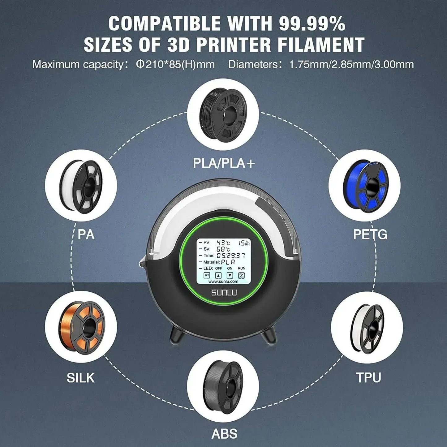 Il sistema di asciugatura Sunlu FilaDryer S2 è un dispositivo che consente di preparare qualsiasi filamento per la stampa in modo comodo e veloce. FilaDryer S2 è stato costruito per trattare senza problemi qualsiasi tipo di materiale, dal PLA a materiali estremamente igroscopici come BVOH e Nylon.