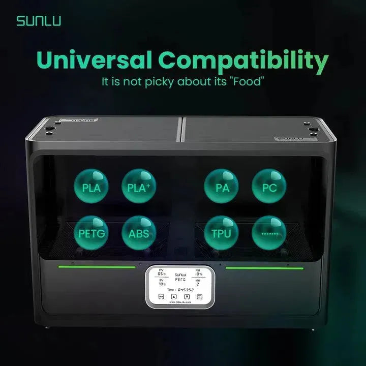 Il FilaDryer S4 di Sunlu è stato progettato per asciugare un'ampia gamma di materiali, dal PLA (anche legno/marmo/seta), ASA, ABS, PA, PC, PETG, HIPS o TPU. La caratteristica più eccezionale del FilaDryer S4 è che può contenere 4 bobine di filamento da 1 kg e può funzionare con filamenti da 1,75 mm, 2,85 mm e 3,00 mm di diametro.