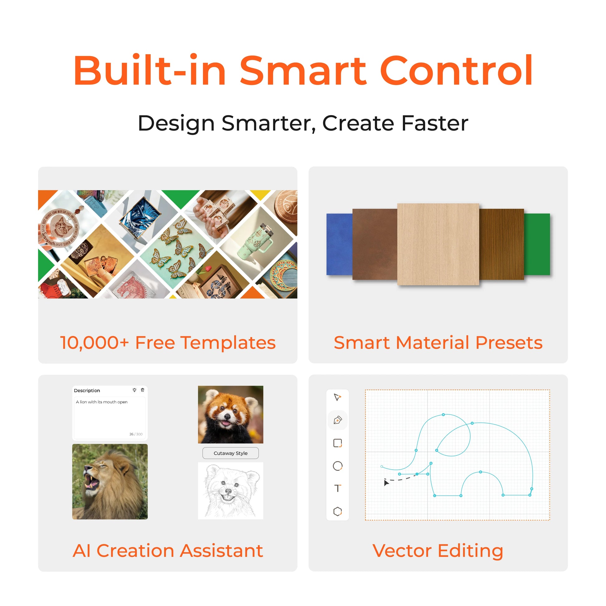 - Generatore AI di Design: trasforma testi o schizzi in progetti pronti per l'incisione in pochi minuti, senza competenze di progettazione