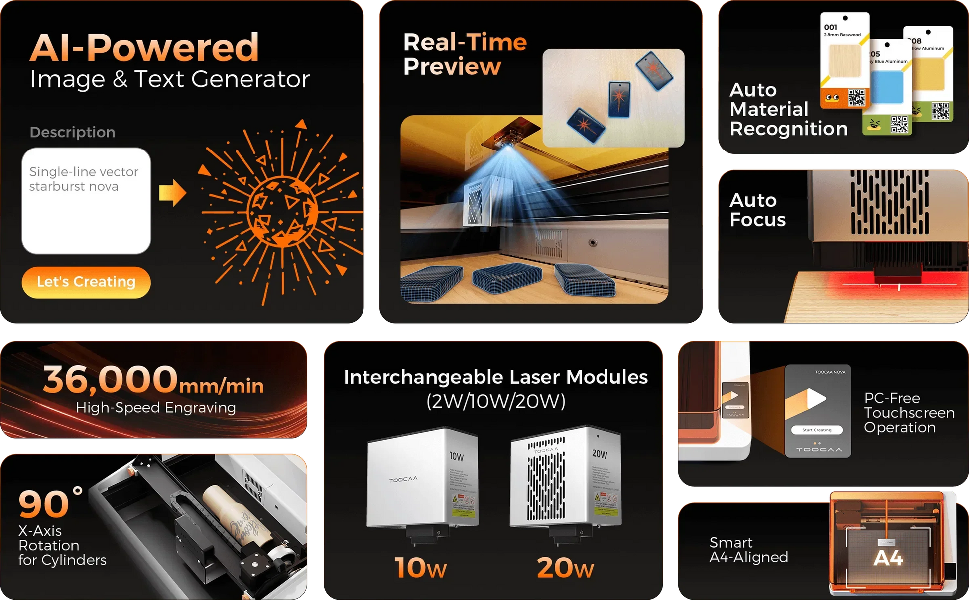 Il TOOCAA NOVA ridefinisce l'incisione laser desktop combinando velocità professionale (36.000 mm/min), sicurezza certificata Classe 1 e intelligenza artificiale integrata. Perfetto per creativi, maker e piccole imprese che cercano prestazioni professionali senza complessità.